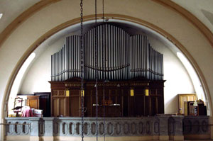 Koppeln und Spielhilfen: Koppeln I/Pedal, II/Pedal, II/I, Suboctav-Koppel II/I, Superoctav-Koppel II/I, Suboctav I, Feste Kombinationen (Piano, Mezzoforte, Forte, Tutti), 2 freie Kombinationen, Walze.