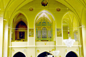 Auf der Empore steht ein Harmonium: J. Strizik & Comp. in Wien.
