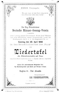Programm: 1. Zedtler: Links, rechts, Sängermarsch; 2. Podbertsky: Ich will meine Seele tauchen, Männerchor; 3. Egressy: Beteg leány, Männerchor; 4. Brixner: Nasswalder G´sangel, Männerchor; 5. Lehnert: Du liebliche Rose, Männerchor; 6. J. Bach: Fantasie, für Violine mit Clavierbegleitung; 7. Blümel: Zwoa kohlschwarze Täuberl, Männerchor; 8. E. Strauss: Serenade, Polka Mazur mit Clavierbegleitung.